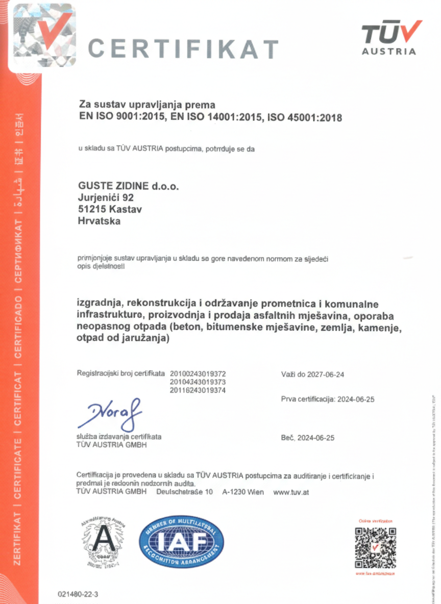 Svi certifikati izdani su od strane TÜV Austria, međunarodno priznatog certifikacijskog tijela, što dodatno potvrđuje vjerodostojnost i usklađenost naših sustava upravljanja s najvišim europskim i svjetskim standardima.